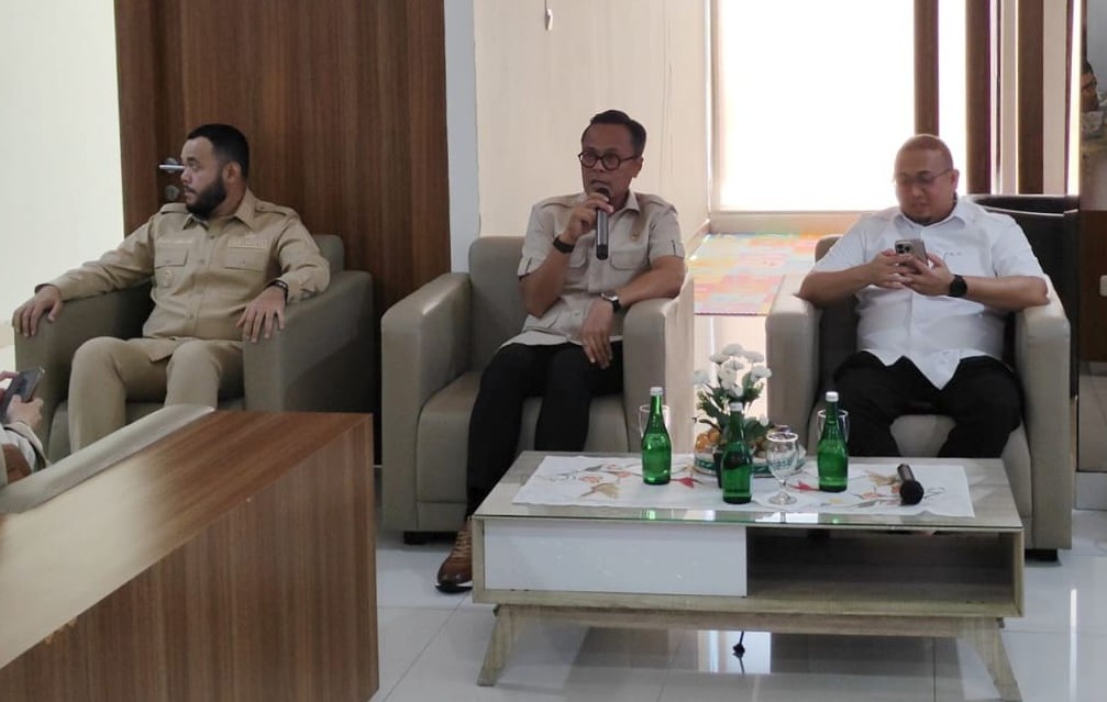 Kepala Badan Pengaturan Badan Usaha Milik Negara (BP BUMN) Dony Oskaria diapit Walikota Padang Fadly Amran dan anggota DPR-RI, Andre Rosiade saat memimpin rapat