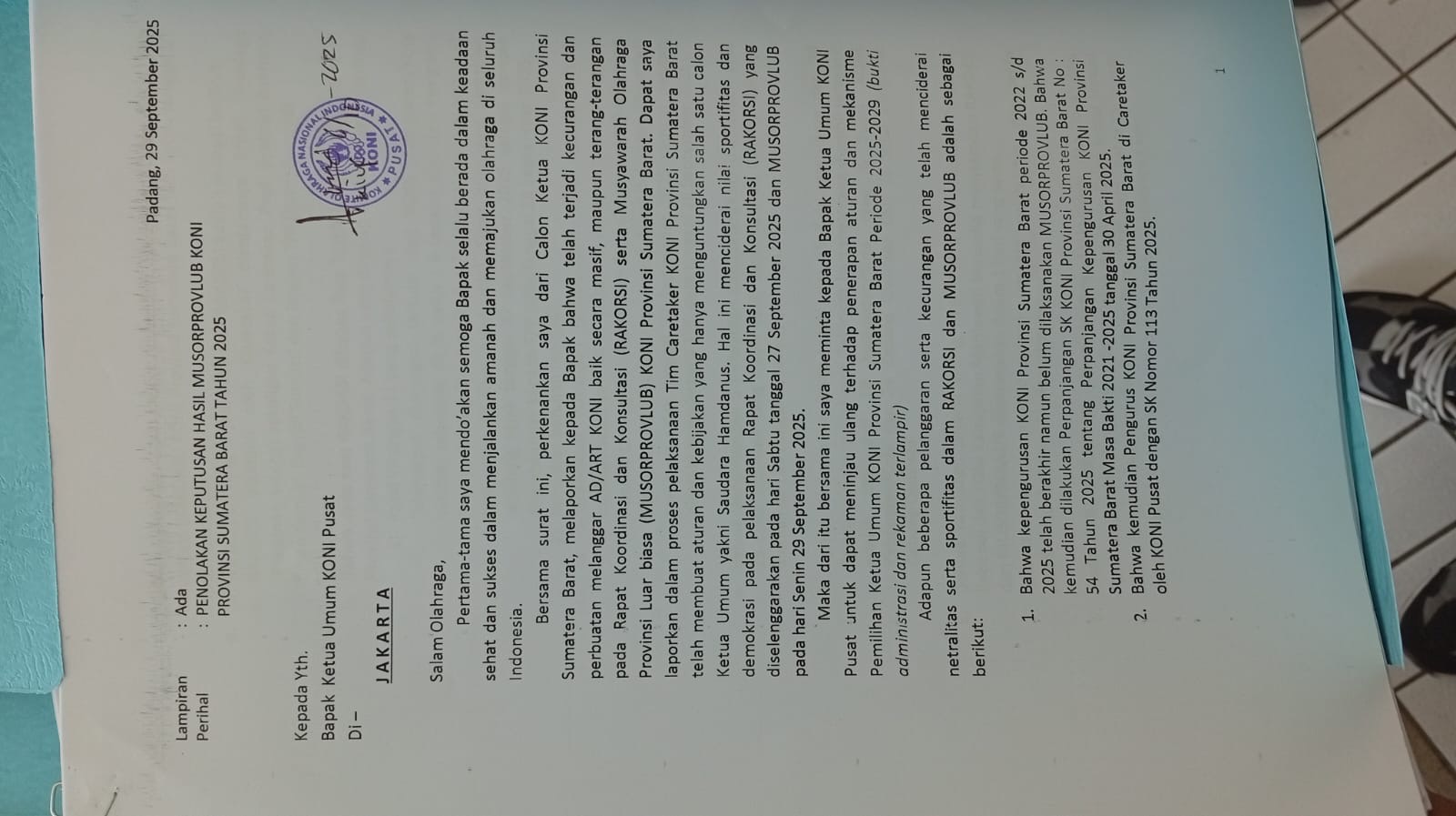 Senin (6/10/25), tokoh muda Ranah Minang ini juga sudah memasukan surat ke KONI Pusat, surat laporan kecurangan Musprovlub itu langsung diterima Ketua KONI Pusat, Marciano Norman.