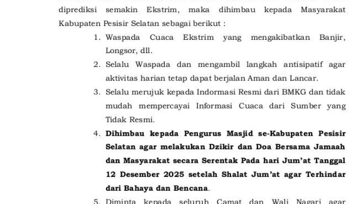 Dalam surat imbauan tersebut Bupati Pesisir Selatan menegaskan pentingnya kewaspadaan dan kesiapsiagaan menghadapi potensi cuaca ekstrem yang dapat menimbulkan bencana.