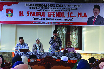 Bukittinggi, khazminang.id- Reses perorangan Ketua DPRD Kota Bukittinggi, H.Syaiful Efendi, Lc, M.A., Daerah Pemilihan (Dapil) Kecamatan Aur Birugo Tigo Baleh (ABTB) Masa Sidang III Tahun 2024/2025 bertempat di rumah dinas Ketua DPRD Kota Bukittinggi kawasan Belakang Balok Kelurahan Belakang Balok Kecamatan ABTB, Sabtu (2/8/2025).