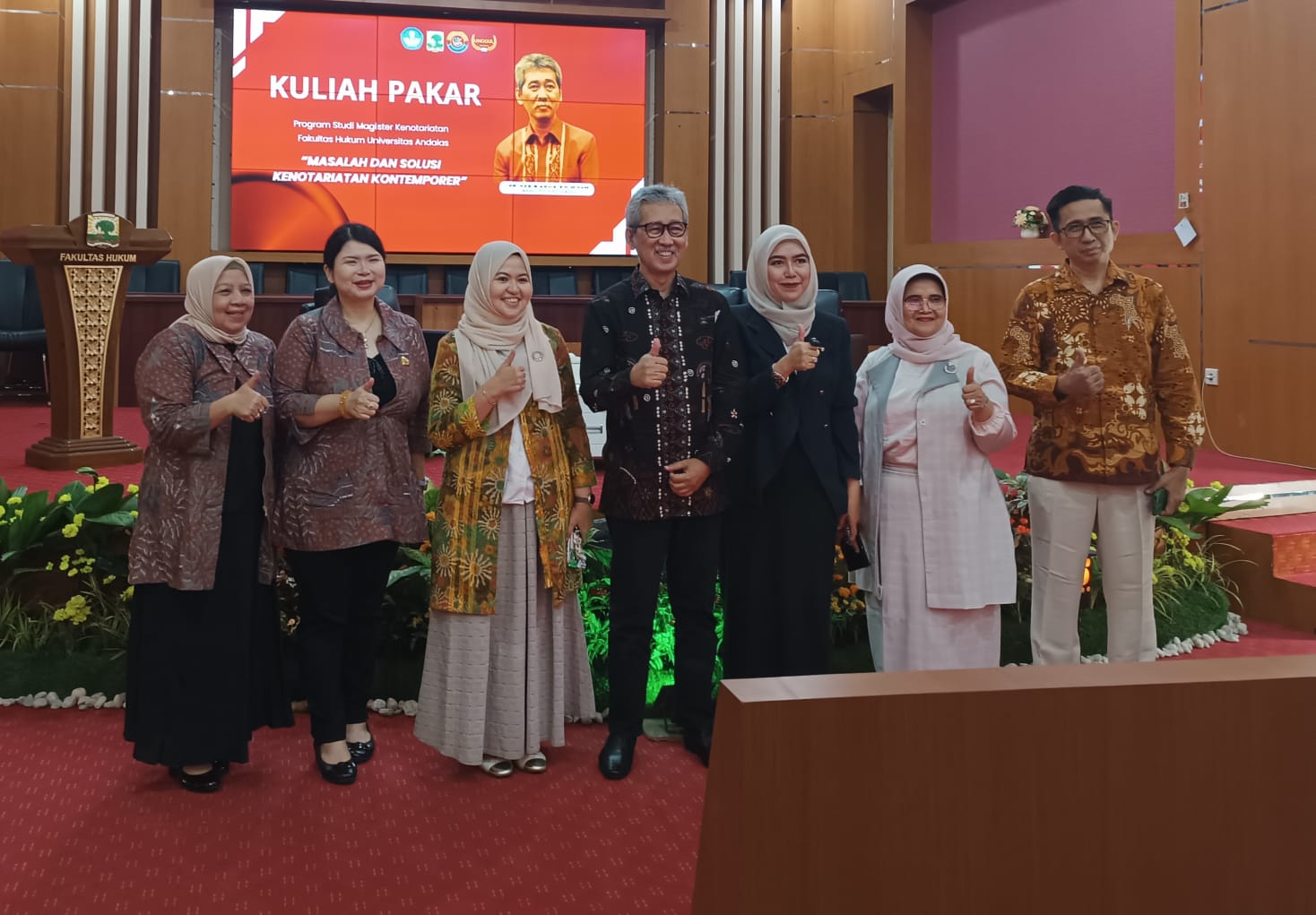 Kuliah pakar yang mengusung tema “Masalah dan Solusi Kenotariatan Kontemporer” ini, diikuti khusus para mahasiswa Program Studi Magister Kenotariatan. Juga hadir Dekan Fakultas Hukum Unand diwakili Wakil Dekan I Dr. Nina Mulyati, SH, MCL, Ketua Prodi Magister Kenotariatan, Dr. Yussy Adelina Mannas, SH, MH, Sekretaris Dr. Misnar Syam, SH, MH, Pengurus Wilayah Ikatan Notaris Indonesia (INI) Sumbar dan jajaran dosen lainnya, Sabtu (28/02/2026) di Kampus Jalan Pancasila No. 10 Padang.