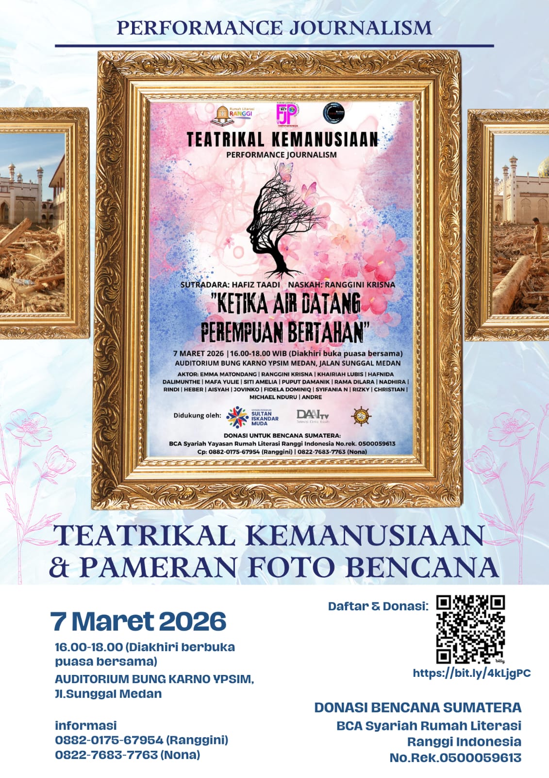 Padang, Khazminang.id – Rasanya sangat rugi jika tak meluangkan waktu untuk menyaksikannya. Sebuah pementasan teatrikal kemanusiaan akan digelar, diperankan oleh para jurnalis perempuan dan seniman teater Medan dengan judul “Ketika Air Datang, Perempuan Bertahan”. Pada Sabtu senja, 7 Maret 2026 mendatang, cahaya lampu panggung dan nyala empati akan hadir di Auditorium Bung Karno Yayasan Perguruan Sultan Iskandar Muda, Jalan Sunggal Medan.