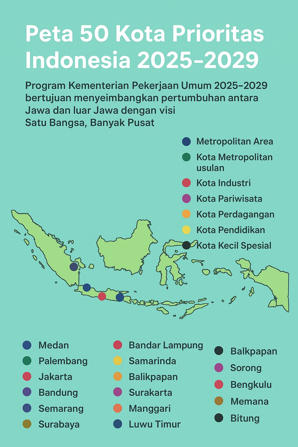 Menteri Pekerjaan Umum Dody Hanggodo mengatakan pembangunan 50 kota itu dirancang untuk menyeimbangkan pertumbuhan ekonomi. Dengan begitu perekonomian lebih merata di seluruh wilayah Indonesia.