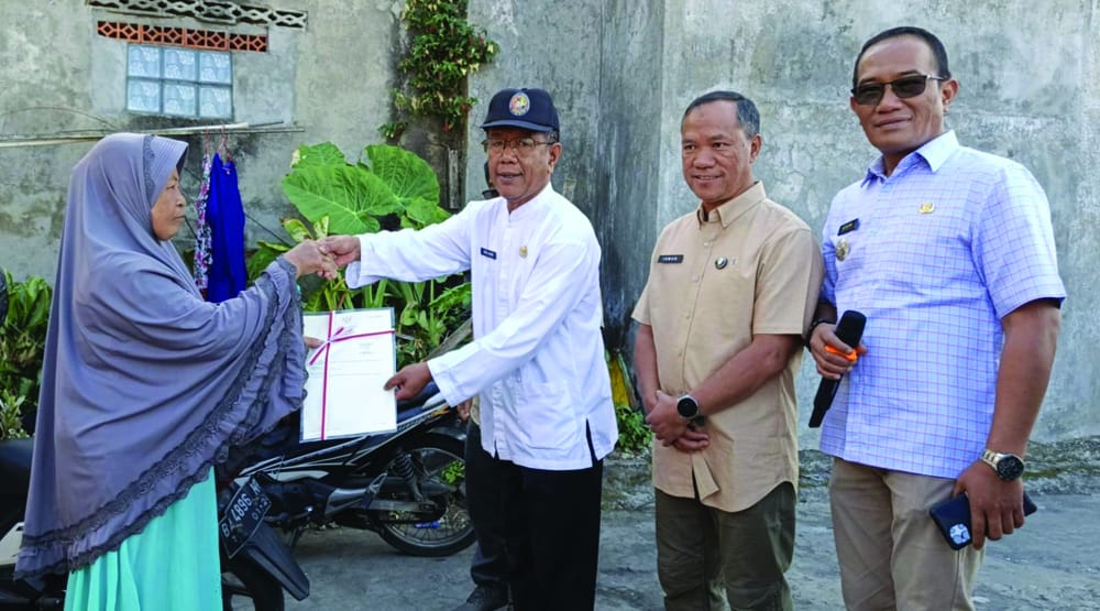 Staf ahli Wali Kota Bukittinggi, Emil Achir didampingi kepala BPN Bukittinggi dan Camat ABTB, menyerahkan sertifikat tanah pengganti kepada korban kebakaran