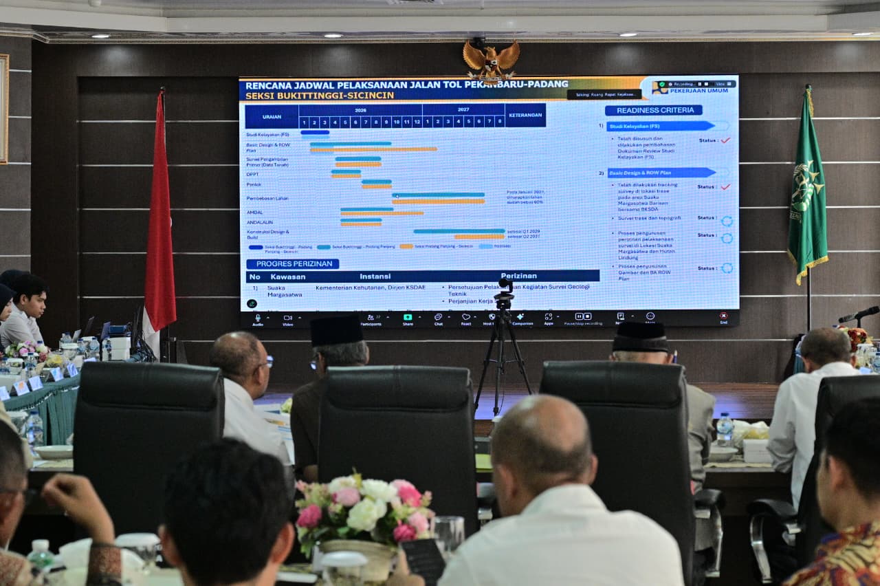“Untuk ruas Bukittinggi–Sicincin, saat ini tengah dipersiapkan oleh PT Hutama Karya, mulai dari studi kelayakan, analisis dampak lingkungan (AMDAL), hingga proses pembebasan lahan,” ujar Dedy Gunawan dalam rapat percepatan pembangunan Jalan Tol Pekanbaru–Padang, khususnya ruas jalan Bukittinggi–Padang Panjang–Sicincin, Kamis (9/4/2026).