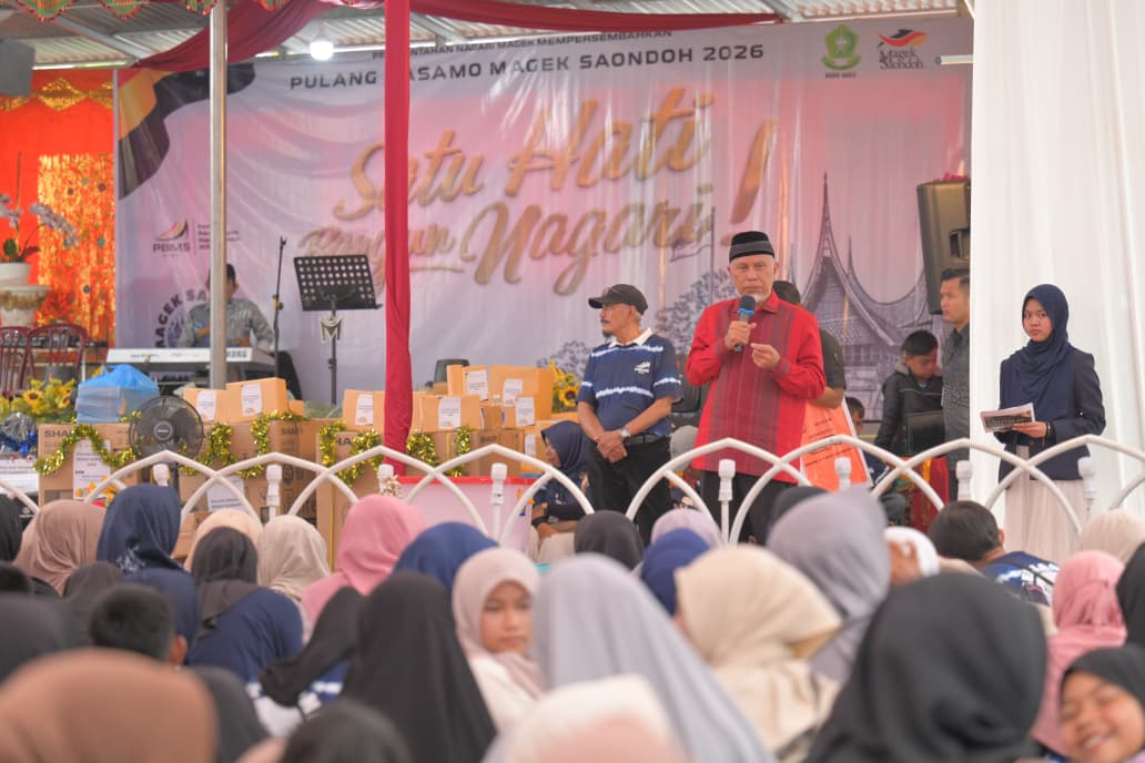 Agam, Khazminang.id — Gubernur Sumatera Barat, Mahyeldi Ansharullah, menghadiri kegiatan Pulang Basamo Magek Saondoh Tahun 2026 yang berlangsung di Nagari Magek, Kecamatan Kamang Magek, Kabupaten Agam, Kamis (26/3/2026). Kegiatan ini menjadi momentum penting untuk mempererat silaturahmi antara perantau dan masyarakat kampung halaman dalam suasana Idulfitri 1447 Hijriah, sekaligus memperkuat sinergi pembangunan nagari.