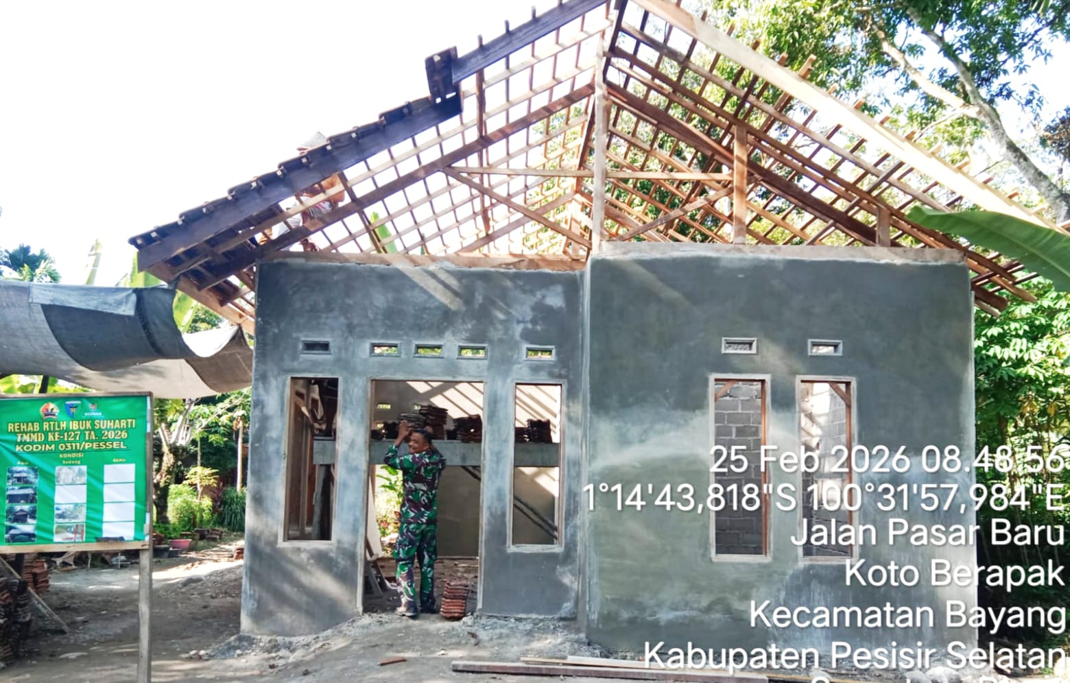 Painan, Khazminang.id – Program TNI Manunggal Membangun Desa (TMMD) ke-127 tahun 2026 yang dilaksanakan oleh Kodim 0311 Pesisir Selatan (Pessel) terus menunjukkan progres signifikan, salah satu sasaran fisik dalam kegiatan tersebut adalah rehabilitasi Rumah Tidak Layak Huni (RTLH) milik Suharti warga Nagari Koto Berapak, Kecamatan Bayang Kabupaten Pesisir Selatan.
