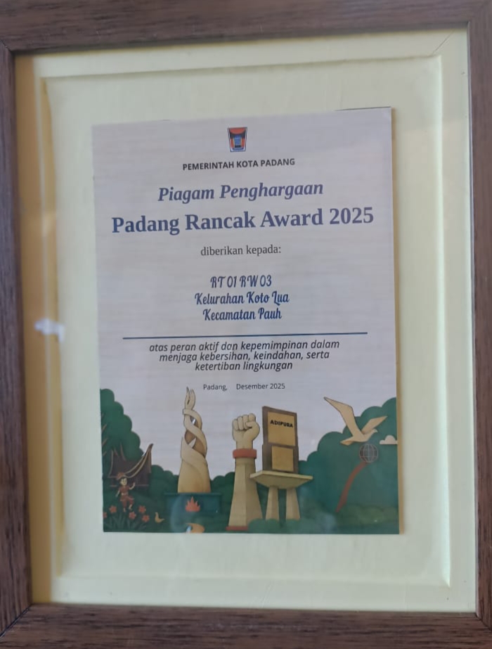 Selanjutnya, sertifikat penghargaan diserahkan kepada Ketua RT 01 RW 03 Komp. Rindang Alam, Ryan Syair di kantor Lurah Koto Lua. Atas capaian itu, RT 01 RW 03 juga berhak menerima uang pembinaan sebesar Rp1,5 juta.