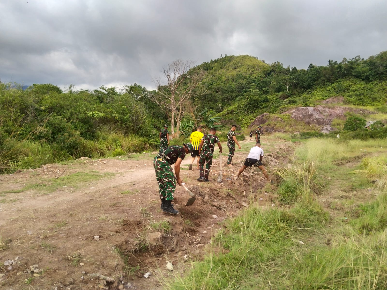 Meski dihadapkan pada kondisi medan yang cukup berat dan cuaca yang tidak menentu, semangat gotong royong antara TNI dan masyarakat tetap tinggi.