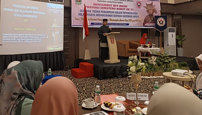 Padang, Khazminang.id – Perempuan memiliki peran strategis dan vital dalam pewarisan serta internalisasi nilai-nilai budaya Minangkabau kepada generasi muda sebagai penerus bangsa. Untuk memperkuat peran tersebut, BKOW Sumbar menggelar seminar “Peranan Perempuan dalam Internalisasi Nilai Budaya Minangkabau Terhadap Generasi Muda”, Jumat (10/10/2025) di Pangeran Beach Hotel Padang.