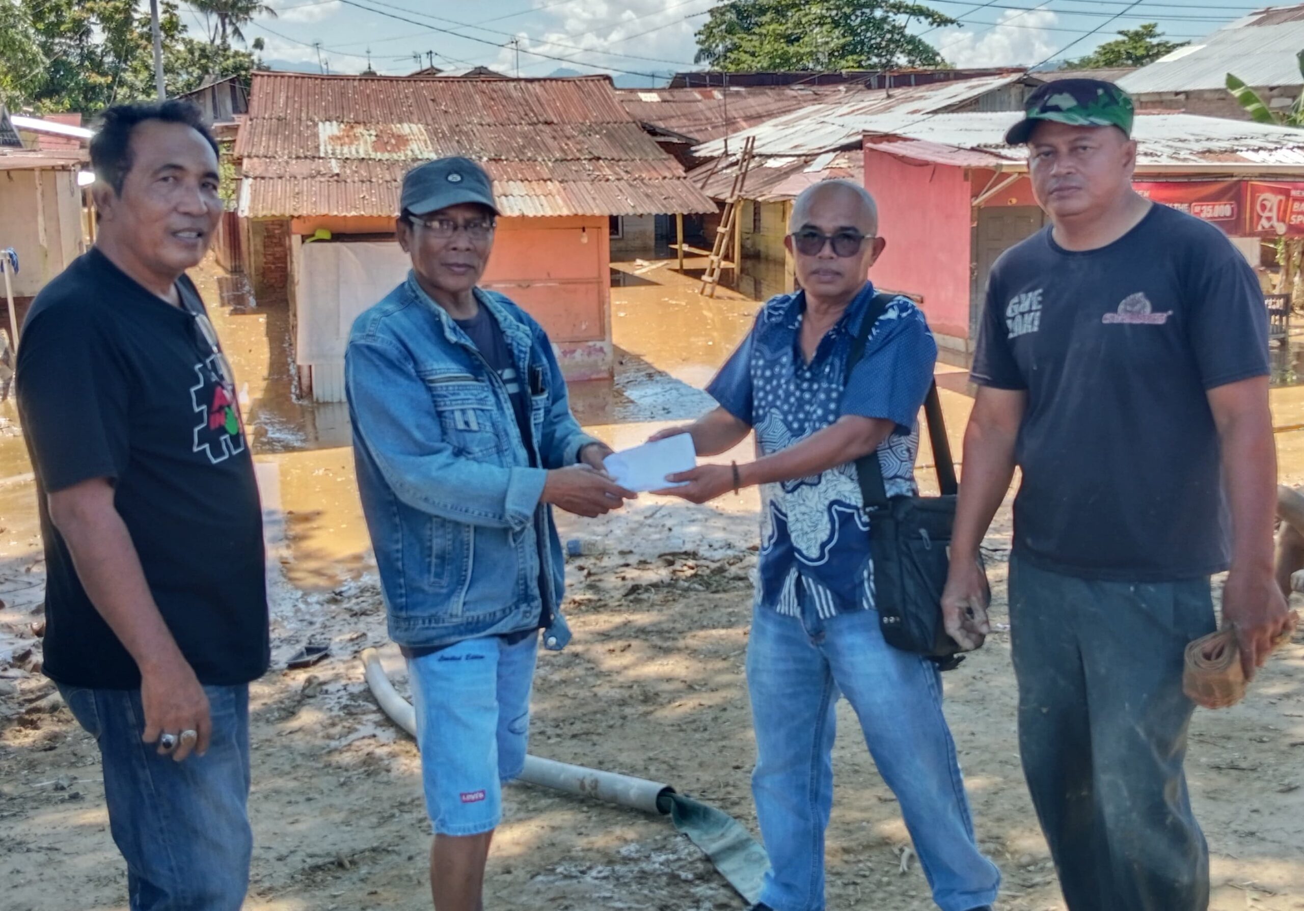 Bantuan dari Tim Peduli Banjir Bandang Sumbar, diserahkan Ketua Perkumpulan Jurnalis Keterbukaan Informasi Publik (PJKIP) Sumbar Almudazir bersama Ketua FWP-SB, Ucok Novrianto kepada Dahnil Ma’rut, perwakilan warga setempat.