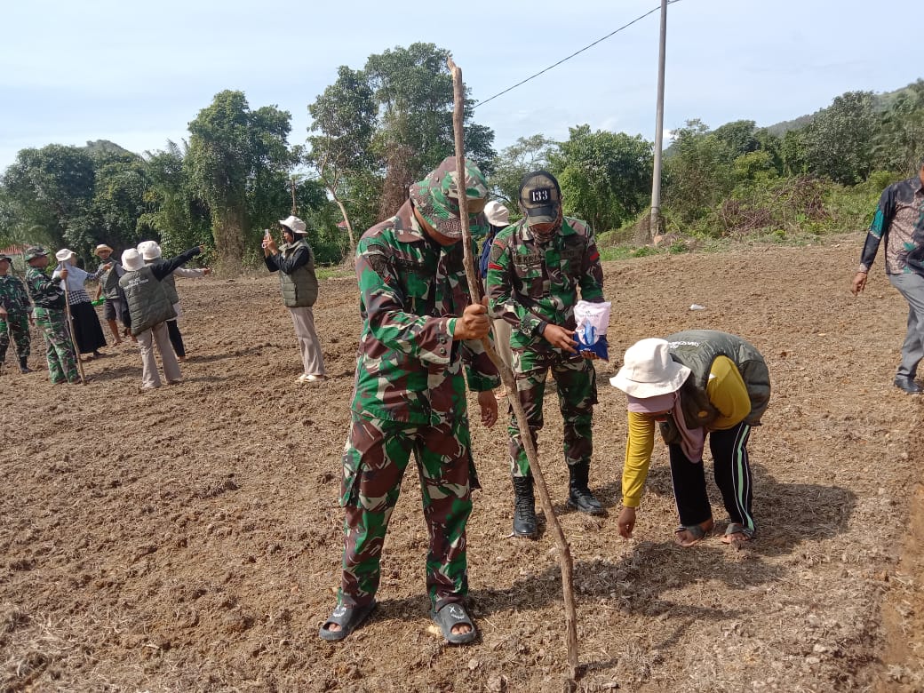Penanaman jagung dilakukan secara gotong royong antara personel Satgas TMMD, anggota brigade ketahanan pangan, beserta masyarakat setempat.
