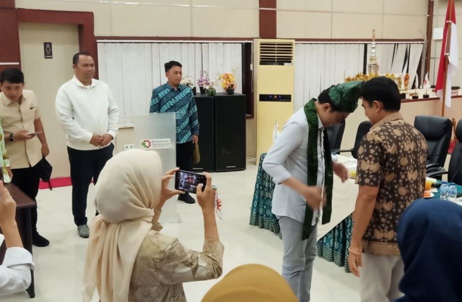 KEPALA BSPJI Padang, Dindin Syafruddin saat mengalungkan syal saat menyambut kedatangan Wamen Perindustrian RI, Faisol Riza, Senin (13/4). RYN